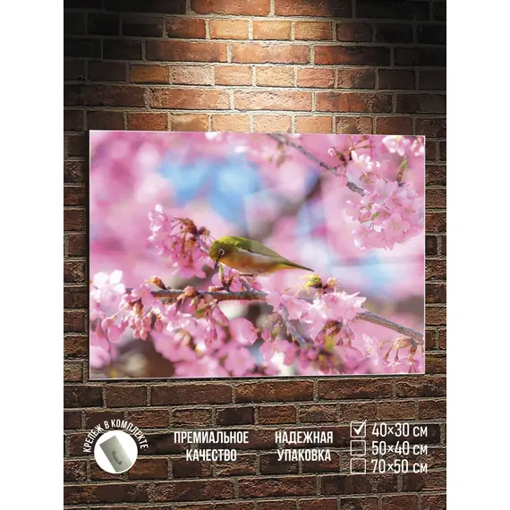 Картина "Птичка На Ветке Сакуры" 40х30 см на стекле