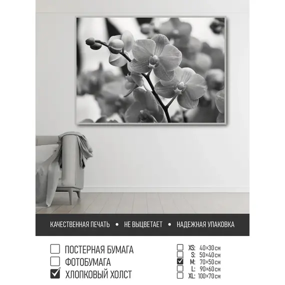 Оживите стены уникальным декором! Плакат Черно Белая Орхидея 70х50 см печатается на трех материалах: