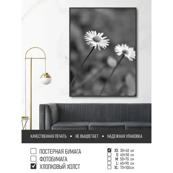 Оживите стены уникальным декором! Плакат Черно Белое Фото Маргаритки 30х40 см печатается на трех материалах: