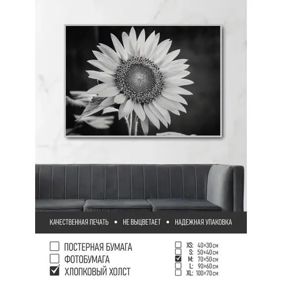 Оживите стены уникальным декором! Плакат Черно Белое Фото Подсолнух 70х50 см печатается на трех материалах: