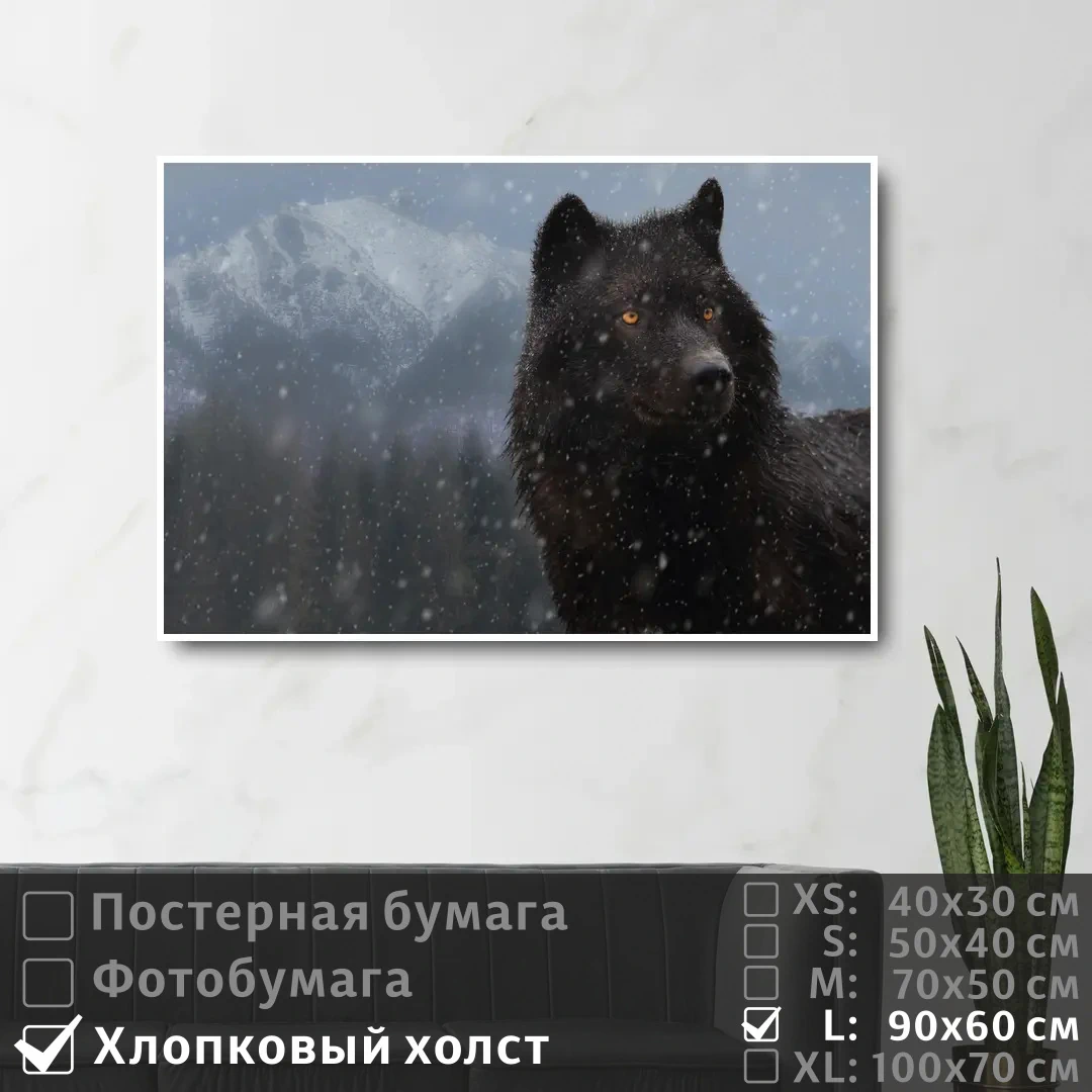 Холст на стену "Черный Волк С Желтыми Глазами" 90х60 см