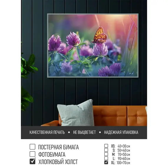 Оживите стены уникальным декором! Плакат Цветы Клевера И Бабочка 100х70 см печатается на трех материалах: