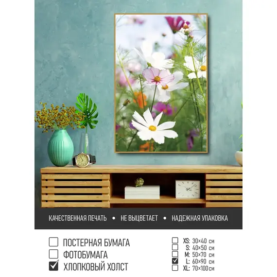 Оживите стены уникальным декором! Плакат Цветы Космеи Летом 60х90 см печатается на трех материалах: