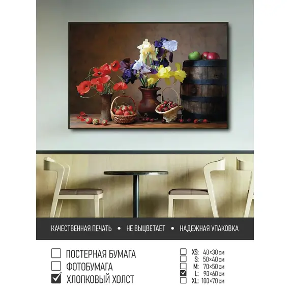 Оживите стены уникальным декором! Плакат Цветы В Вазах Ягоды И Фрукты 90х60 см печатается на трех материалах: