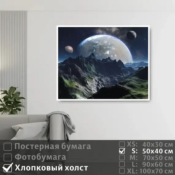Оживите стены уникальным декором! Плакат Фантастическая Гора В Галактике С Планетами 50х40 см печатается на трех материалах: