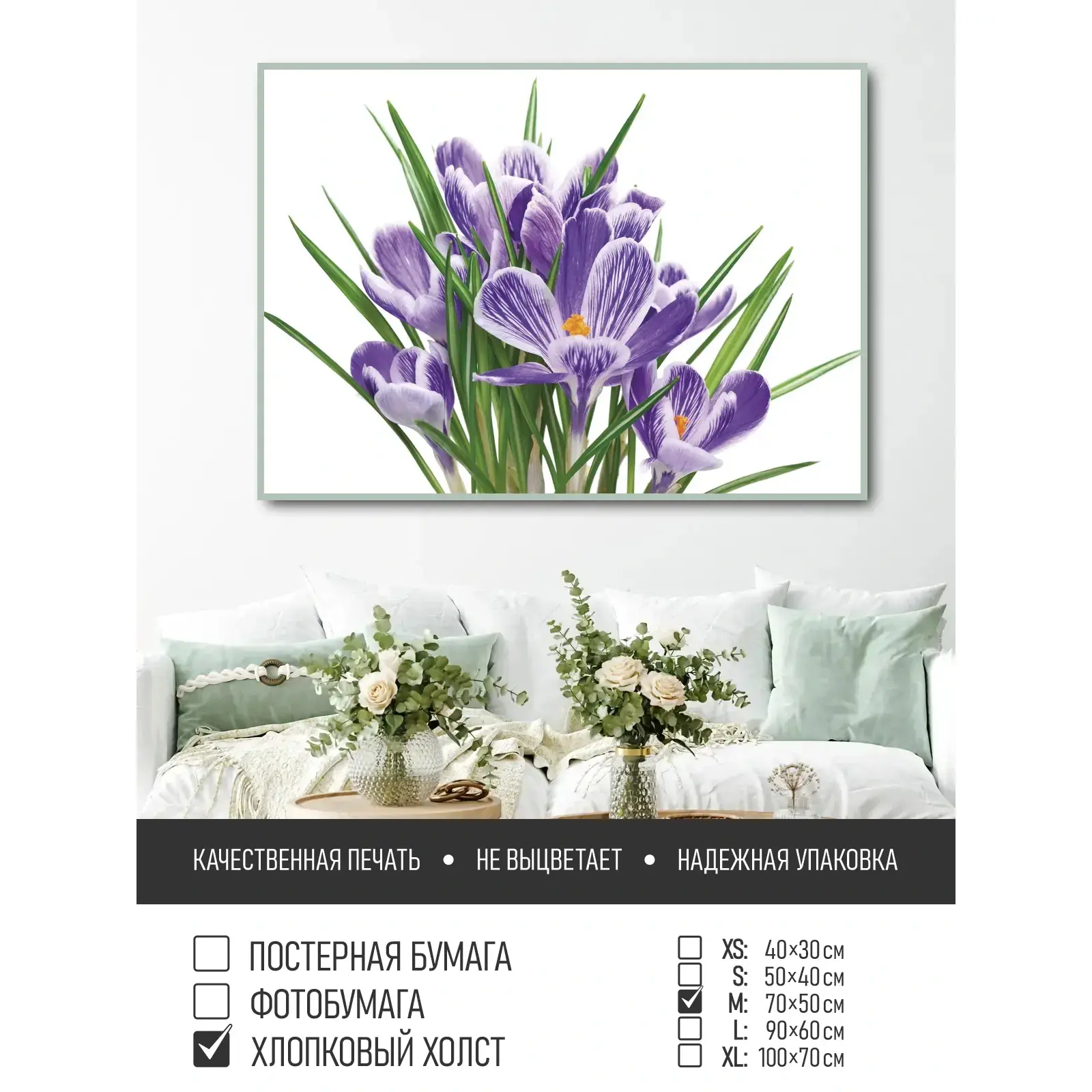Оживите стены уникальным декором! Плакат Фиолетовые Крокусы Белый Фон 70х50 см печатается на трех материалах:
