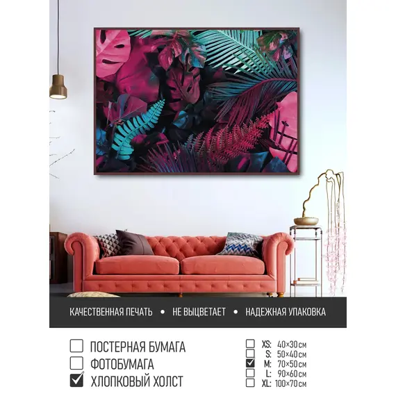 Оживите стены уникальным декором! Плакат Фон Яркие Тропические Листья 70х50 см печатается на трех материалах: