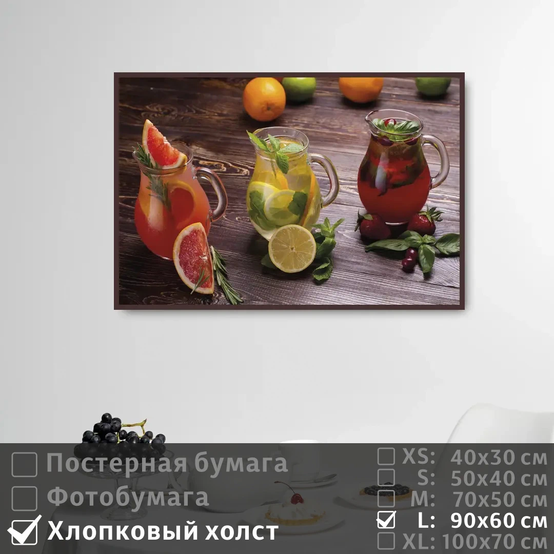 Оживите стены уникальным декором! Плакат Фруктовый Сок В Кувшинах 90х60 см печатается на трех материалах: