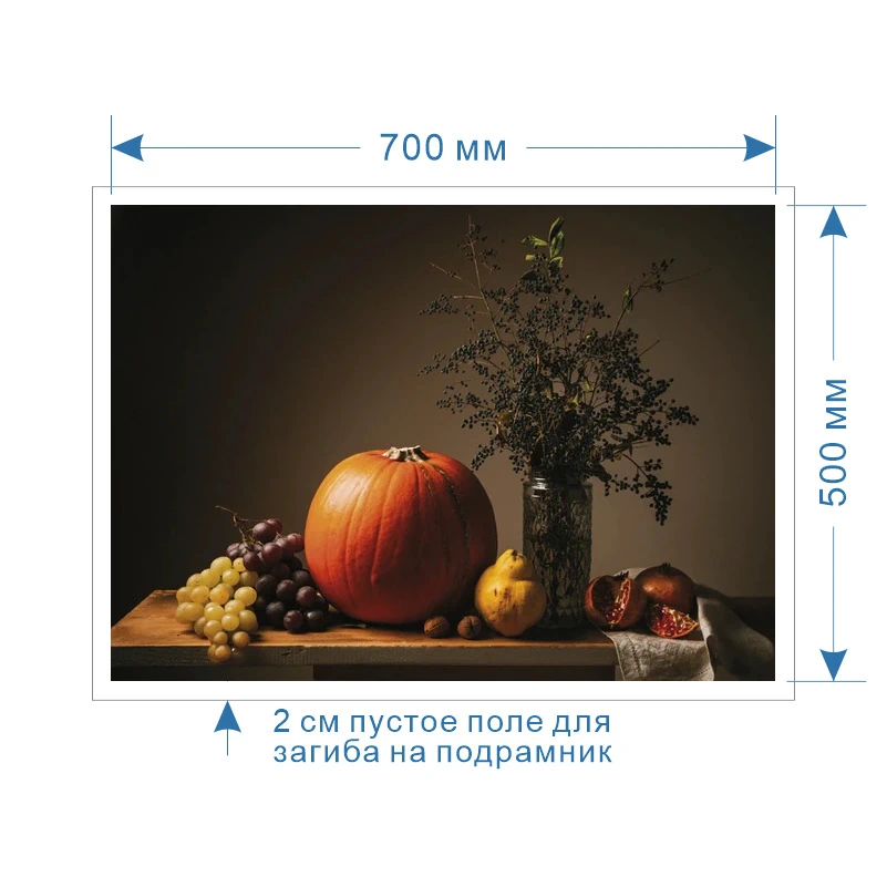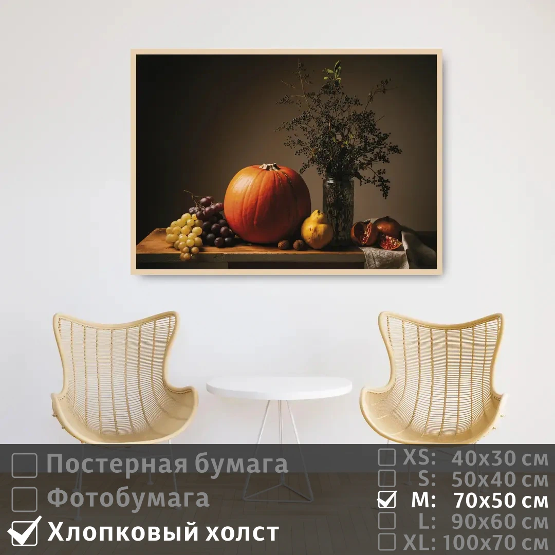 Оживите стены уникальным декором! Плакат Фрукты И Овощи На Столе С Полевыми Цветами 70х50 см печатается на трех материалах:
