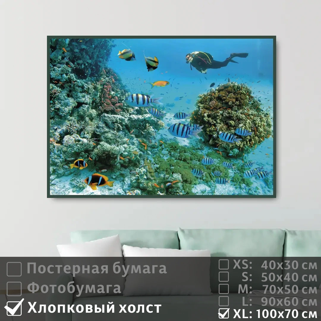 Оживите стены уникальным декором! Плакат Морские Рыбы Под Водой С Дайвером 100х70 см печатается на трех материалах: