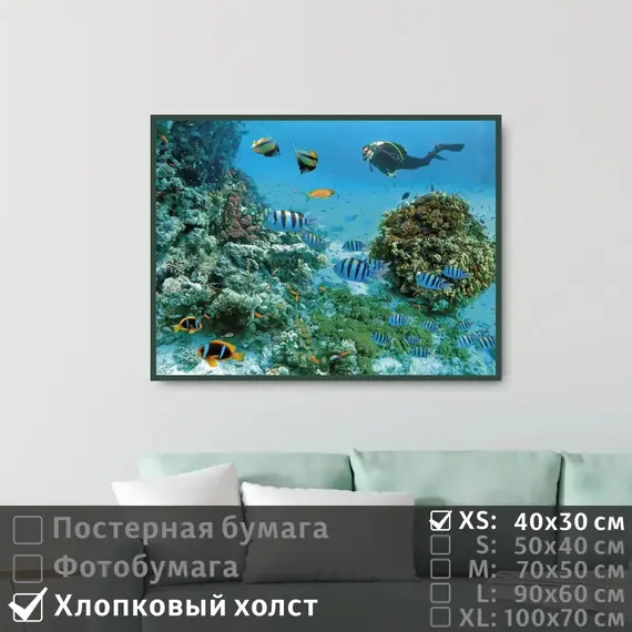 Оживите стены уникальным декором! Плакат Морские Рыбы Под Водой С Дайвером 40х30 см печатается на трех материалах: