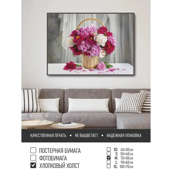 Оживите стены уникальным декором! Плакат Натюрморт Пионы В Корзинке 70х50 см печатается на трех материалах:
