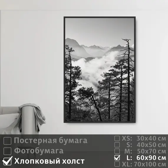 Оживите стены уникальным декором! Плакат Туман В Лесу Черно Белое Фото 60х90 см печатается на трех материалах: