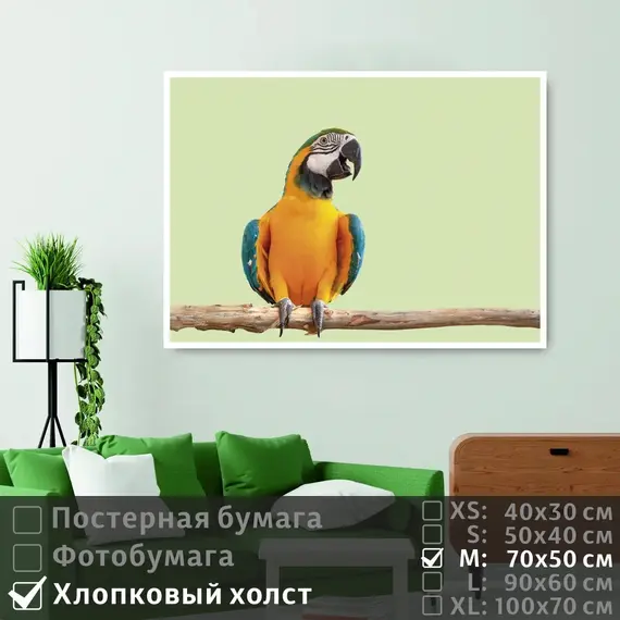 Оживите стены уникальным декором! Плакат Яркий Попугай Ара На Ветке 70х50 см печатается на трех материалах: