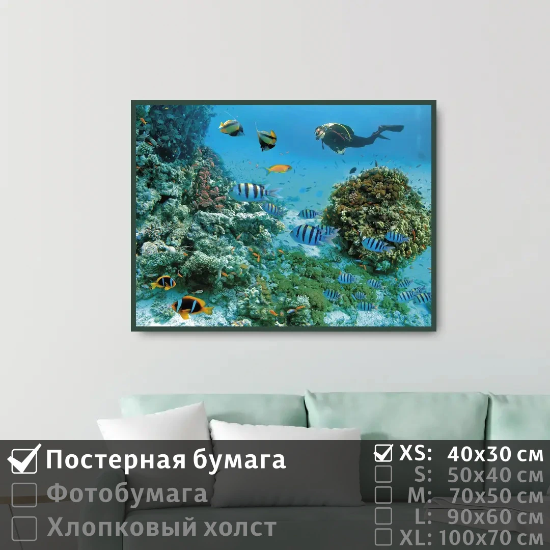 Оживите стены уникальным декором! Плакат Морские Рыбы Под Водой С Дайвером 40х30 см печатается на трех материалах:
