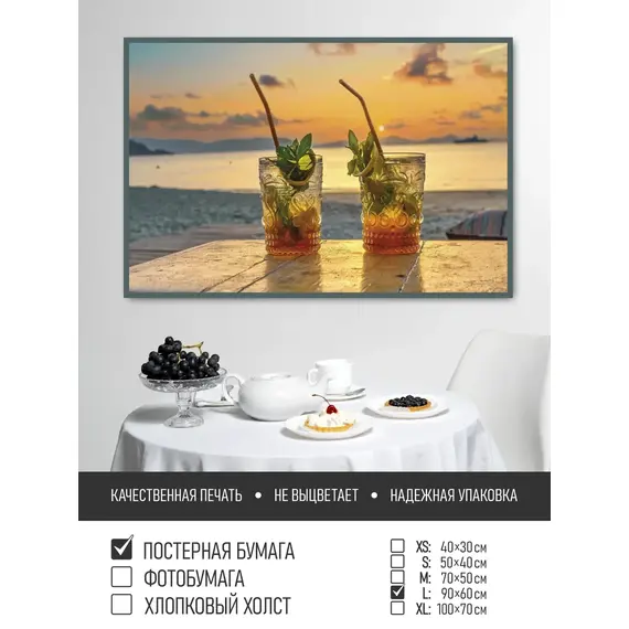 Оживите стены уникальным декором! Плакат Напитки На Закате На Пляже 90х60 см печатается на трех материалах: