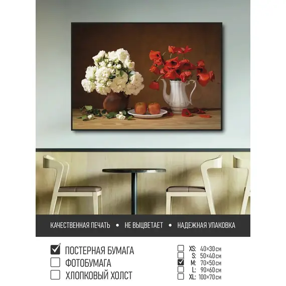 Оживите стены уникальным декором! Плакат Натюрморт Две Вазы С Цветами 70х50 см печатается на трех материалах: