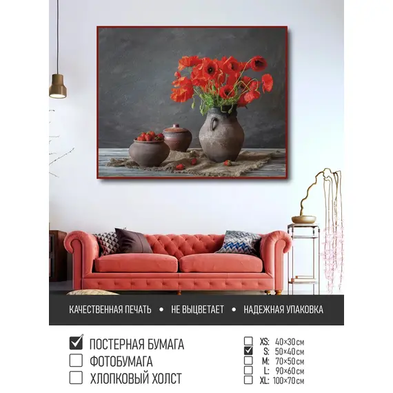 Оживите стены уникальным декором! Плакат Натюрморт Маки И Клубника 50х40 см печатается на трех материалах: