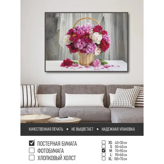 Оживите стены уникальным декором! Плакат Натюрморт Пионы В Корзинке 70х50 см печатается на трех материалах: