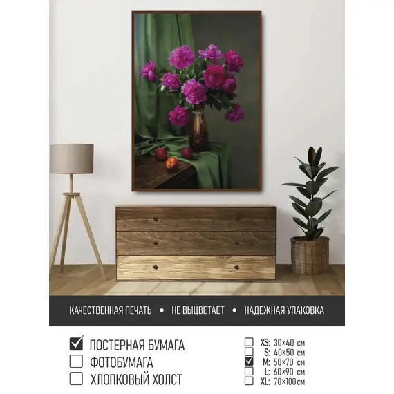 Оживите стены уникальным декором! Плакат Натюрморт Пионы Ваза Фрукты 50х70 см печатается на трех материалах: