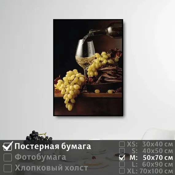 Оживите стены уникальным декором! Плакат Натюрморт Вино И Виноград 50х70 см печатается на трех материалах: