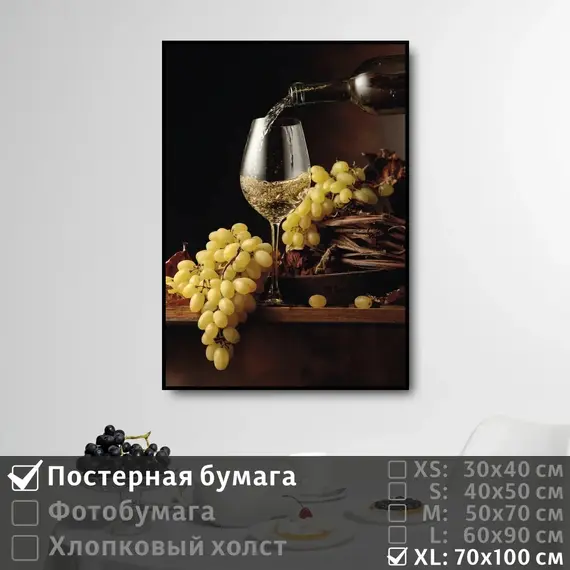 Оживите стены уникальным декором! Плакат Натюрморт Вино И Виноград 70х100 см печатается на трех материалах: